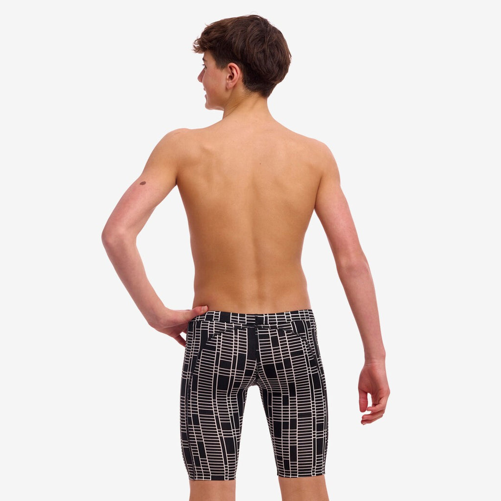 Der Jungen Trainings Jammer von Funky Trunks ist ein beliebtes Modell für Schwimmer und Triathleten. Die Nähte sind extra flach, die Beinöffnung ist bequem geschnitten und für den besten Halt versteckt sich im Bund ein Kordelzug. Der Zwickel hat ein leichtes Innenfutter, damit auch alles blickdicht ist.